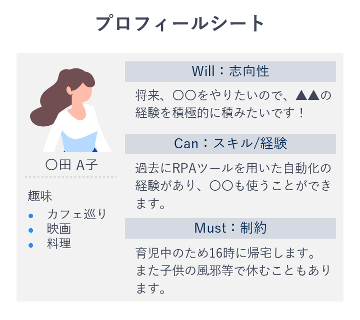 自分自身のパーソナリティを簡潔に相手へ伝えられる様に、プロフィートシートを作成して伝えるべき事を整理しておくと良いでしょう。