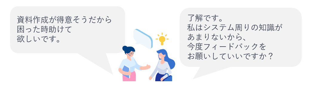 自分自身のこれまでの経験や持っているスキルを相互に伝えておくと、何か困った時にお互い手助けしやすくなります。
