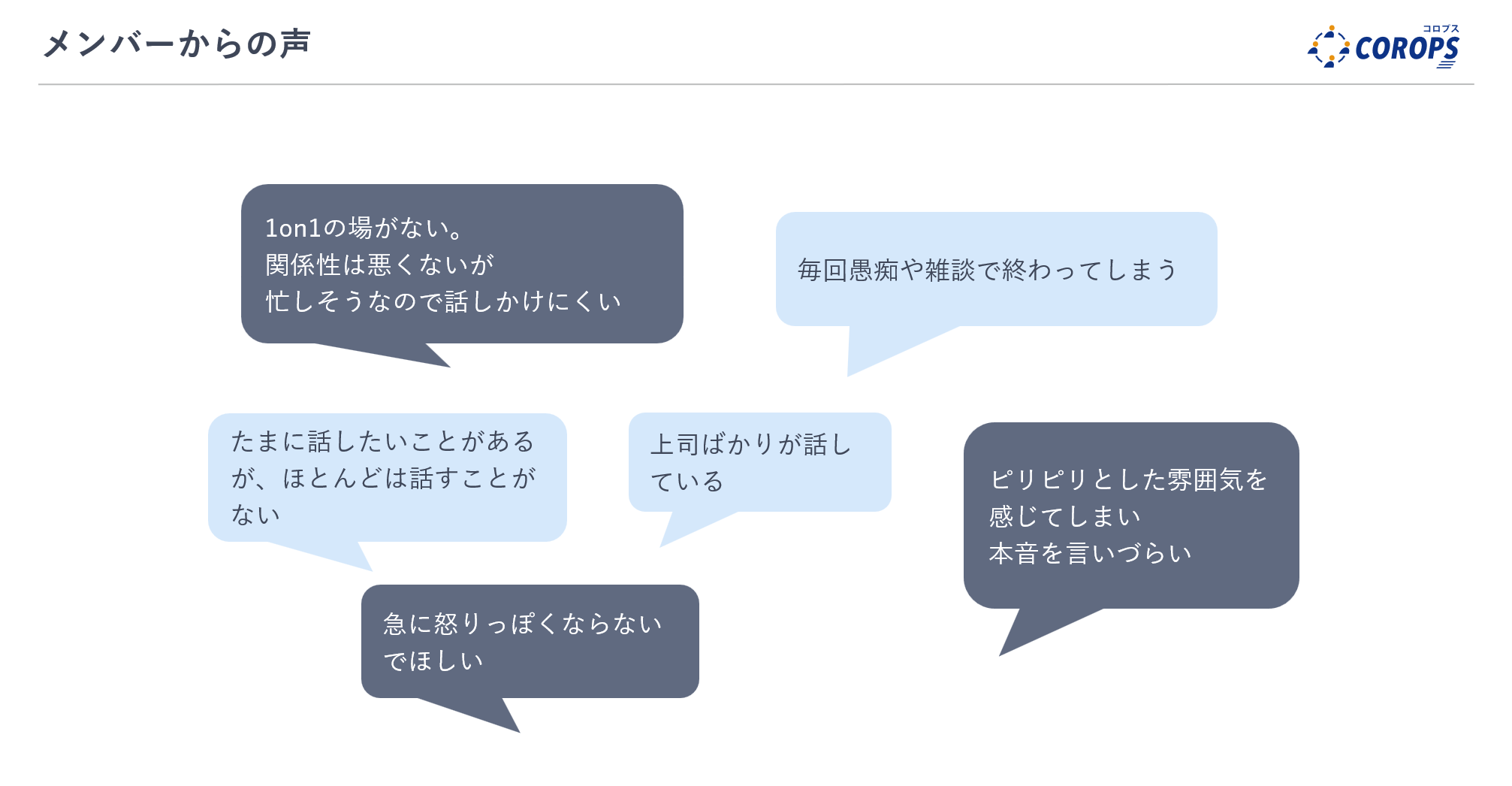 - スタンスは部下のため(上司が指導や評価を行う場ではなく、部下の意見を傾聴し支援する場とする)