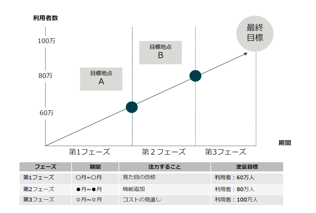 目標が決まったら、そこに行くまでの中間地点と必要な要素は何か?ということも洗い出しておくことが重要です。