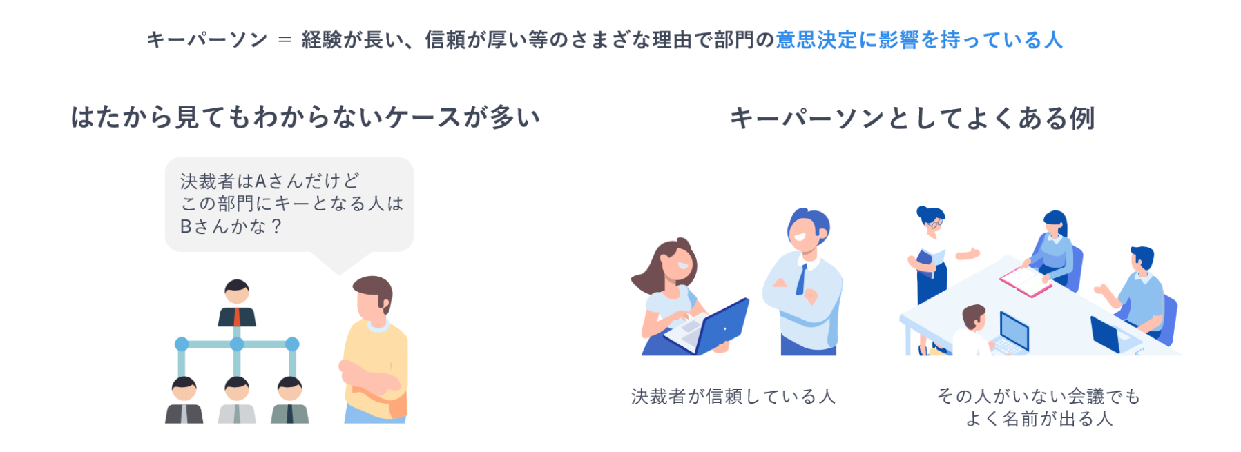 キーパーソンとは、経験が長い・信頼が厚いなどにより、組織の意思決定に