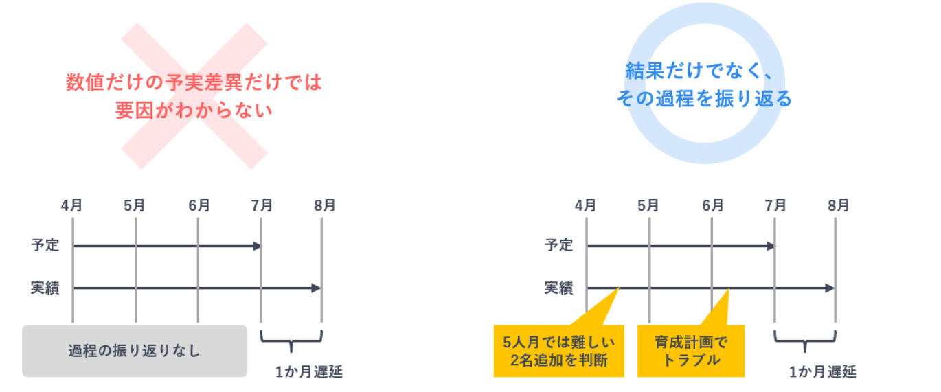 振り返りを行う際は、予実差(計画(予) と 実際の結果(実) の間に生じた差)を確認します。