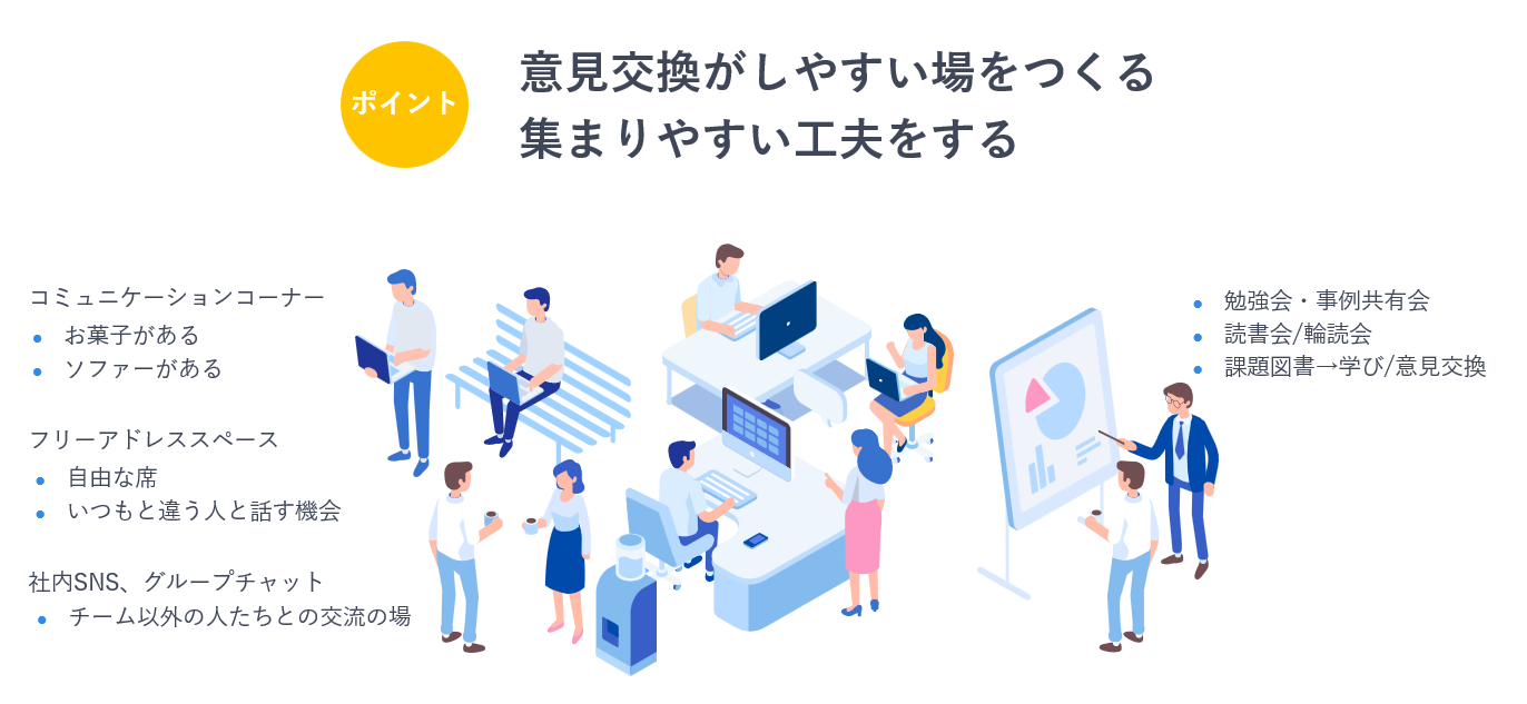 社員が自発的に集まりやすくし、情報交換をしやすくしている企業も出てきています。