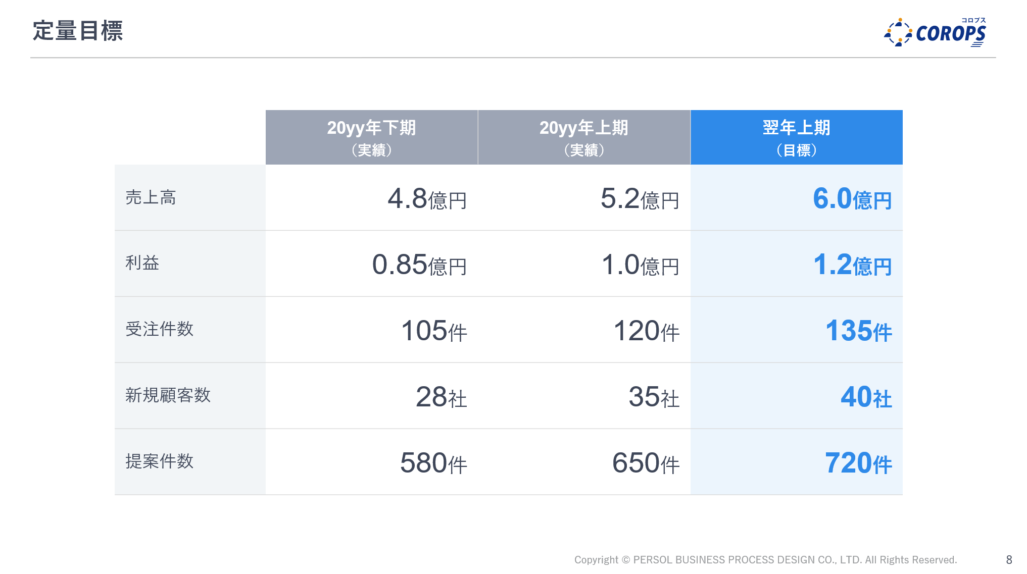 前期実績と次期目標を並べることで、チーム全員が目標を共有しやすくなり、達成に向けた意識も高まります。