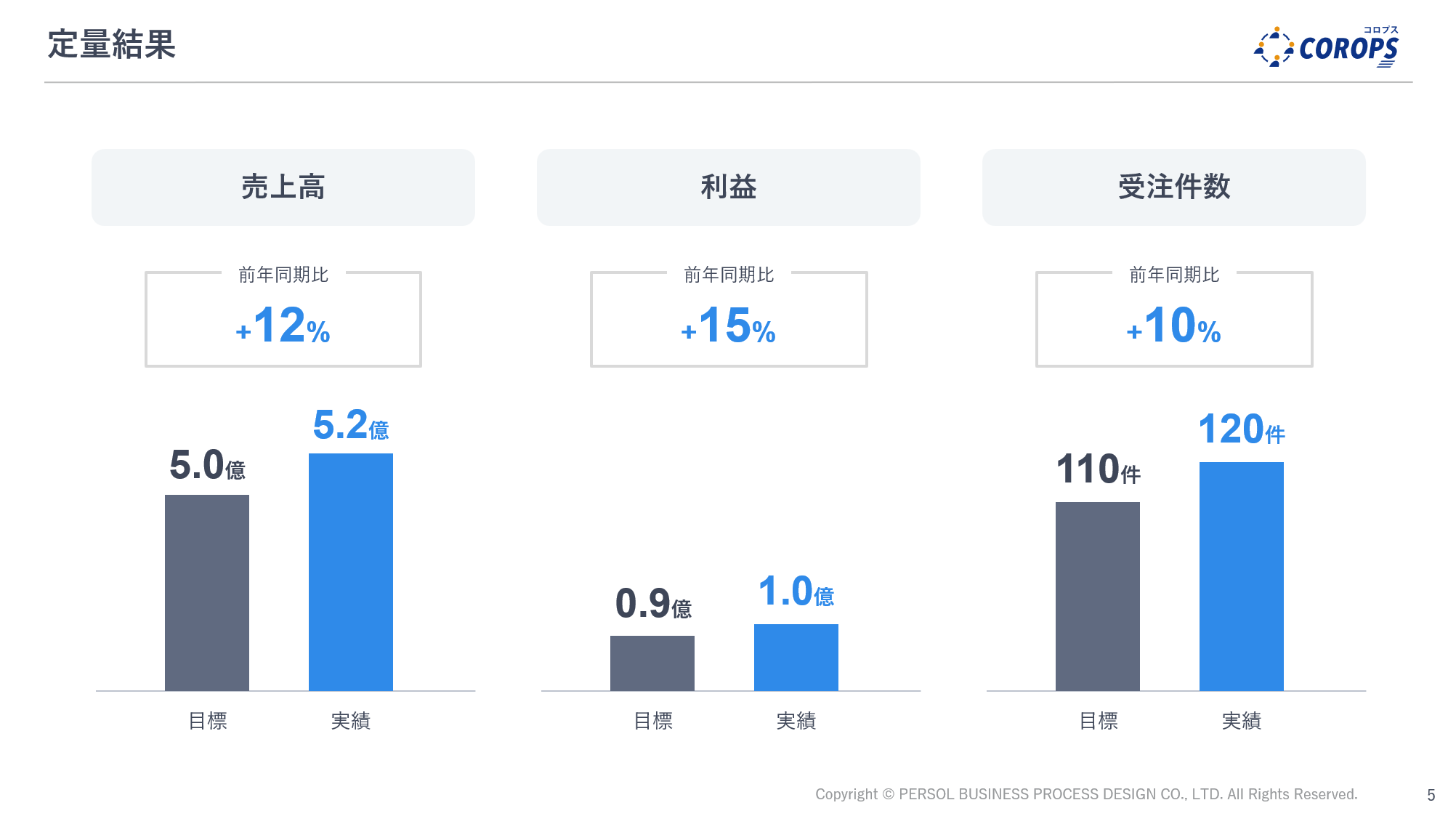 成果は、売上・利益・受注件数などを目標と実績を並べて示すことで、達成度が明確になります。