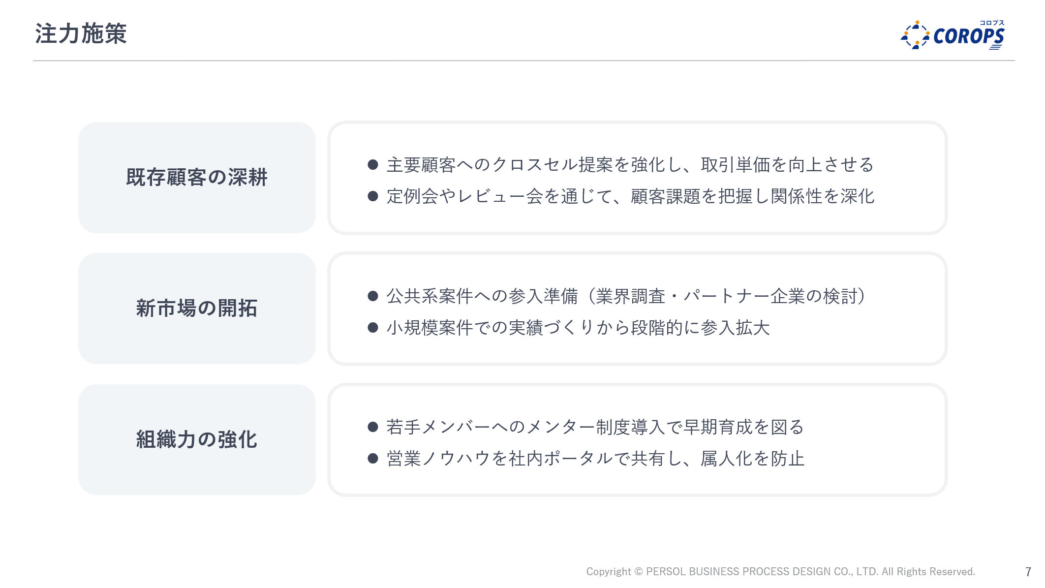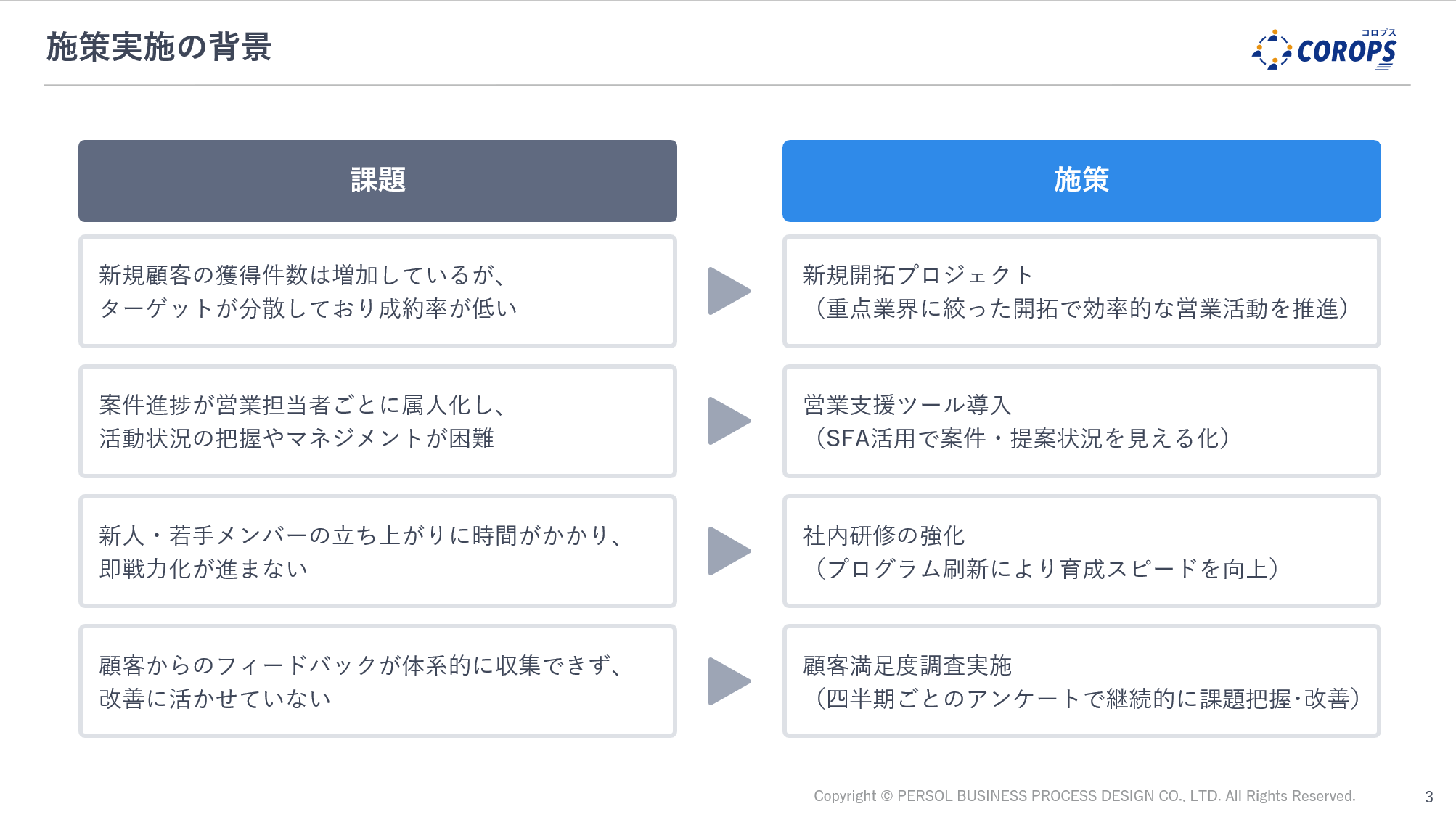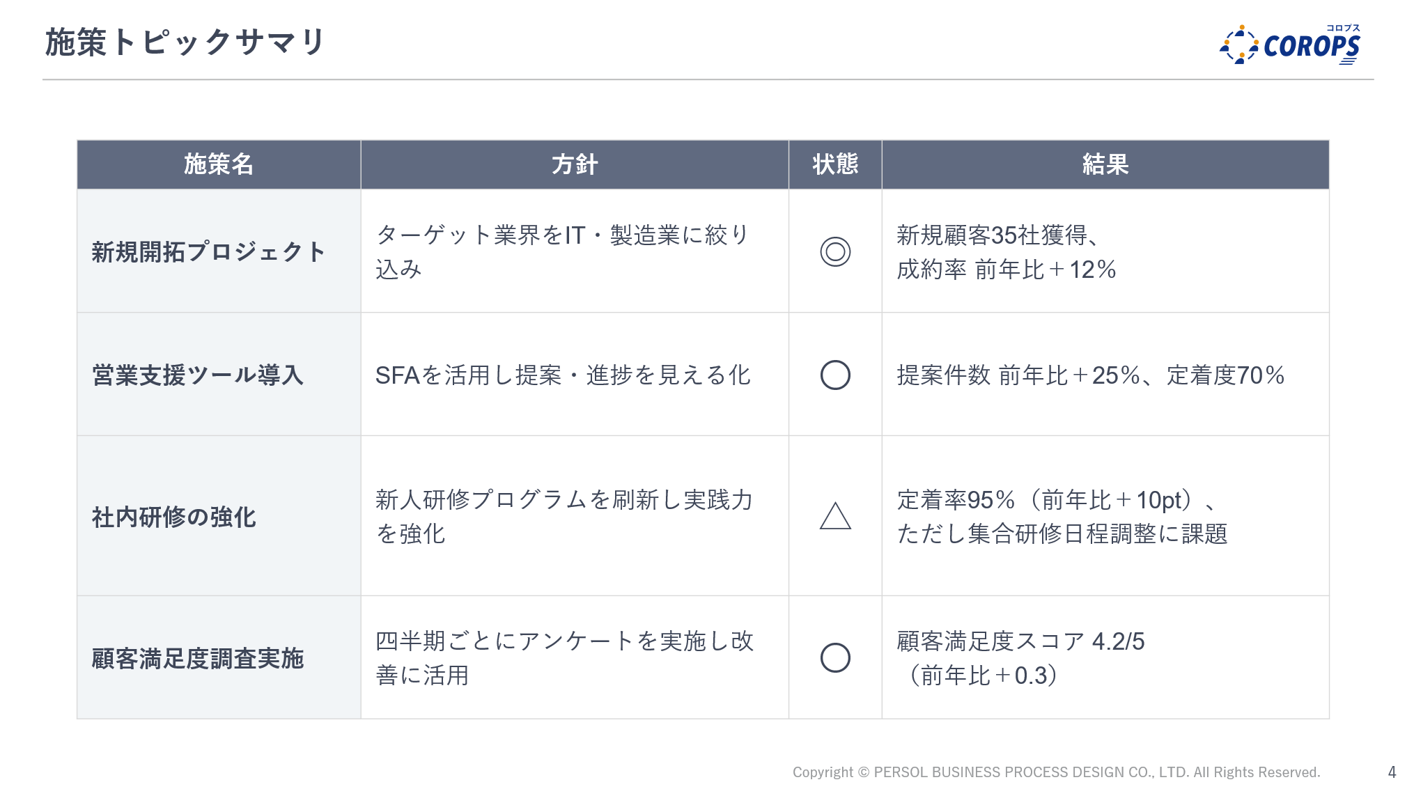 → 情報を詰め込みすぎず、「背景→施策→成果」の流れを守る。 -