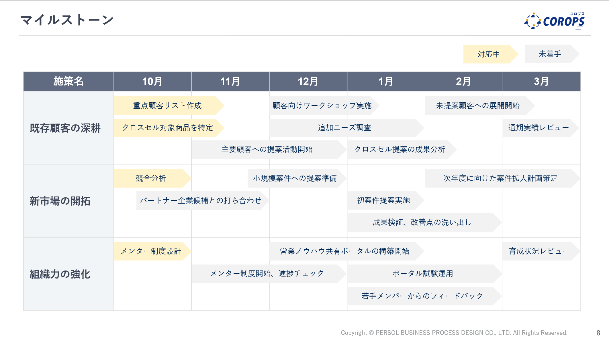 さらにマイルストーンで施策ごとの進め方を整理することで、計画性や方針が伝わりやすくなります。