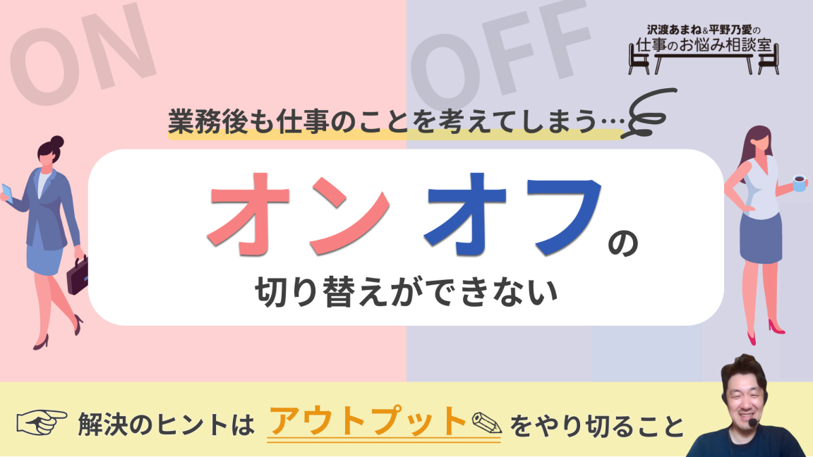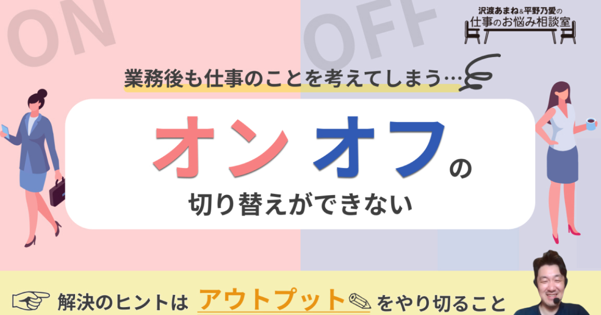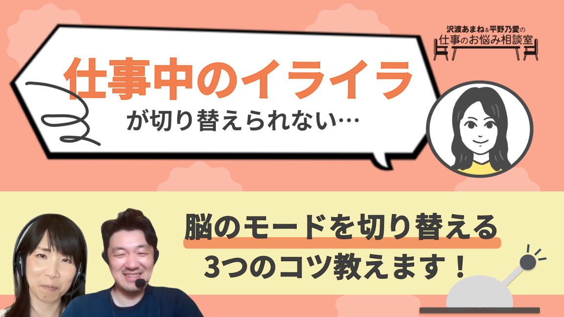 日頃仕事をしながら抱えているよくある悩みを、COROPSの監修に携わって頂いた沢渡あまねさん、平野乃愛さんとの対談を通じて、解決の糸口になるヒントを見つけていく企画です。今回のテーマは「気持ちの切替」です。 たいていのことは、「悩みは寝たら忘れる」ことができます。しかし、状況が変わってやることが増えてくると、納得する成果を出せないことが増え、気持ちは落ち込み、寝ても忘れられなくなる、そんな経験はありませんか。 そんなときに、どうやって気持ちを切り替えればよいのか。今回のコンテンツは、あまねさん、のあさんの実体験も踏まえた内容を皆さんへお伝えします。